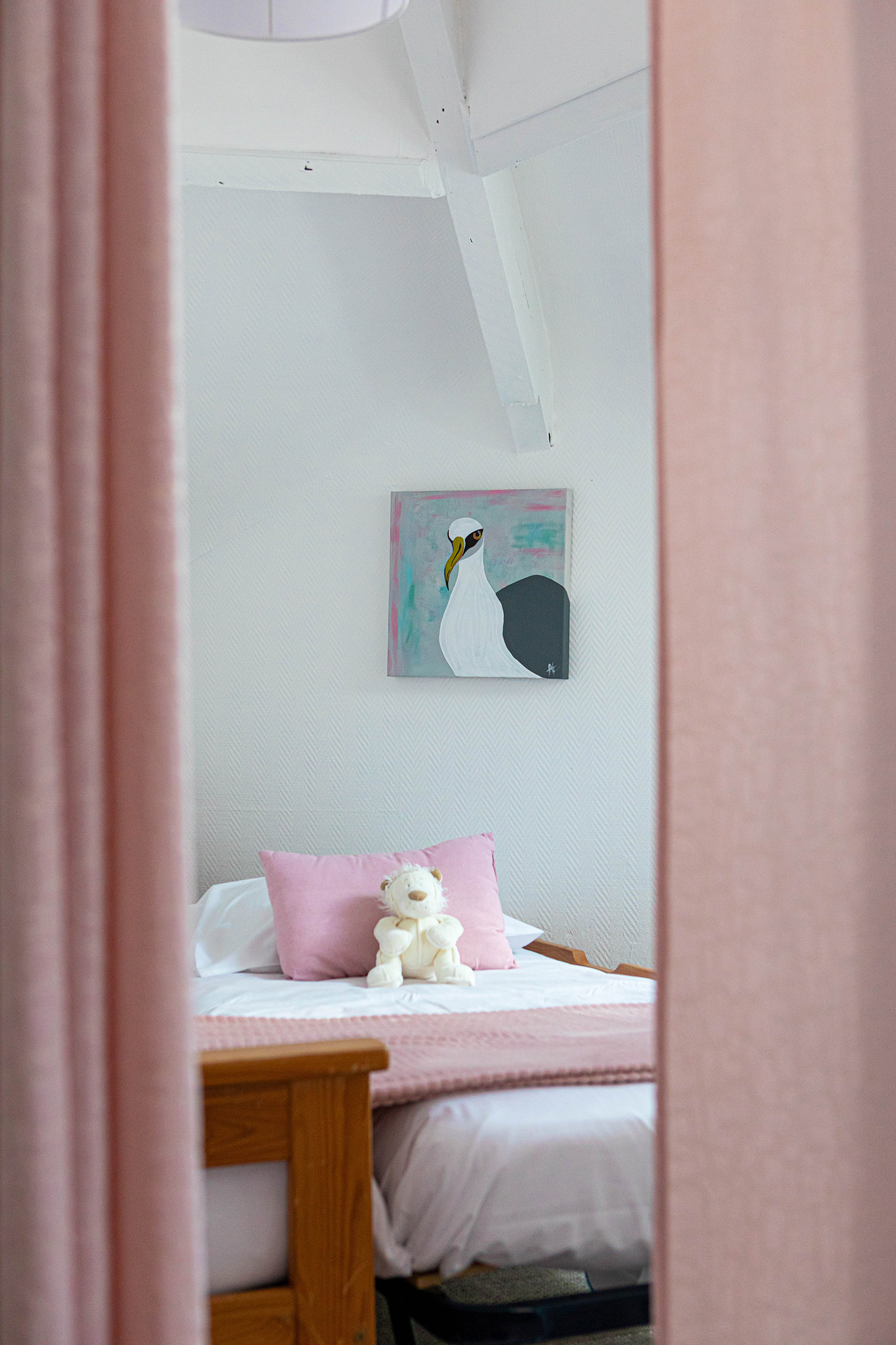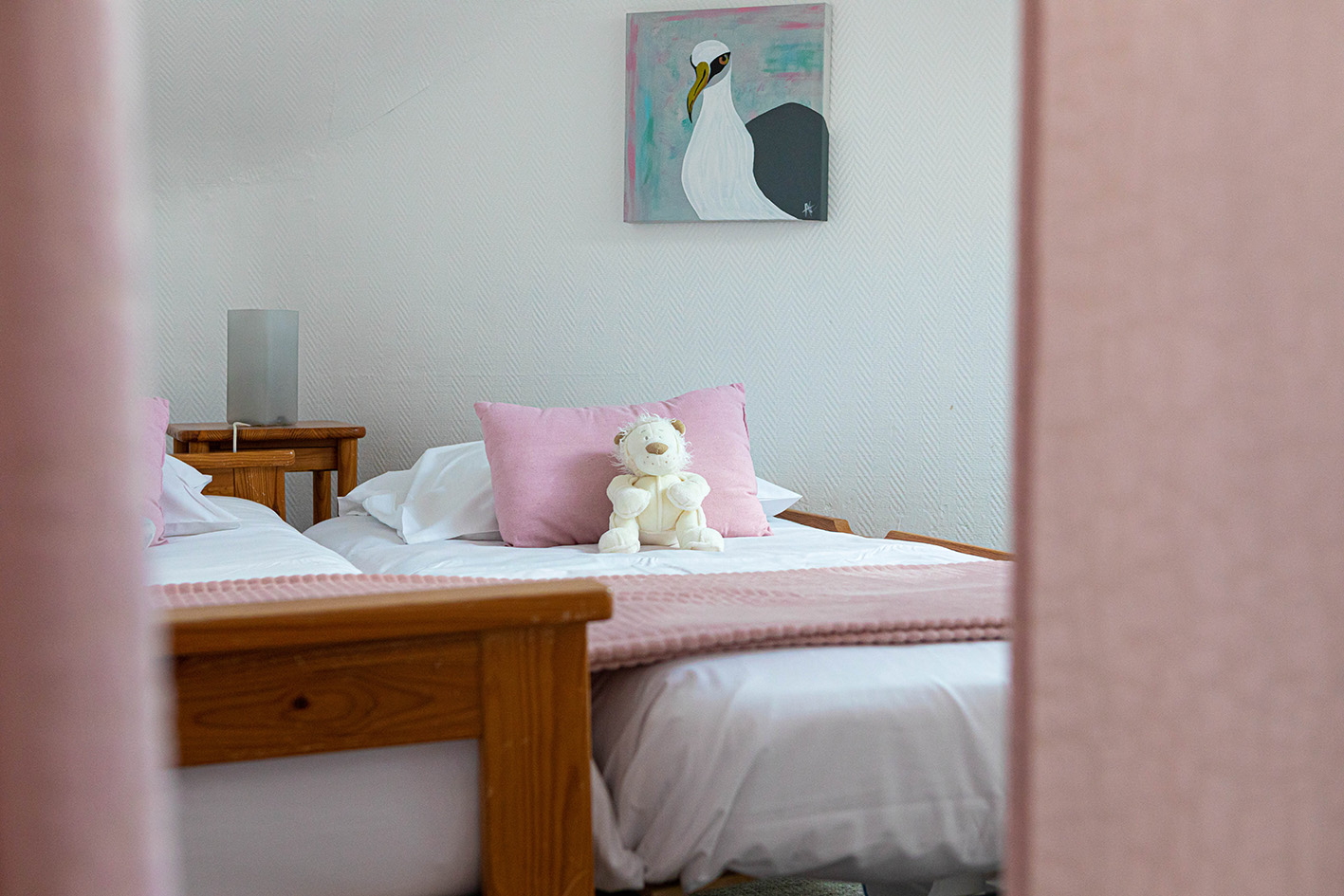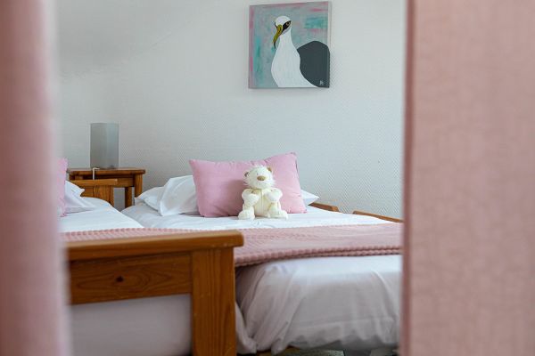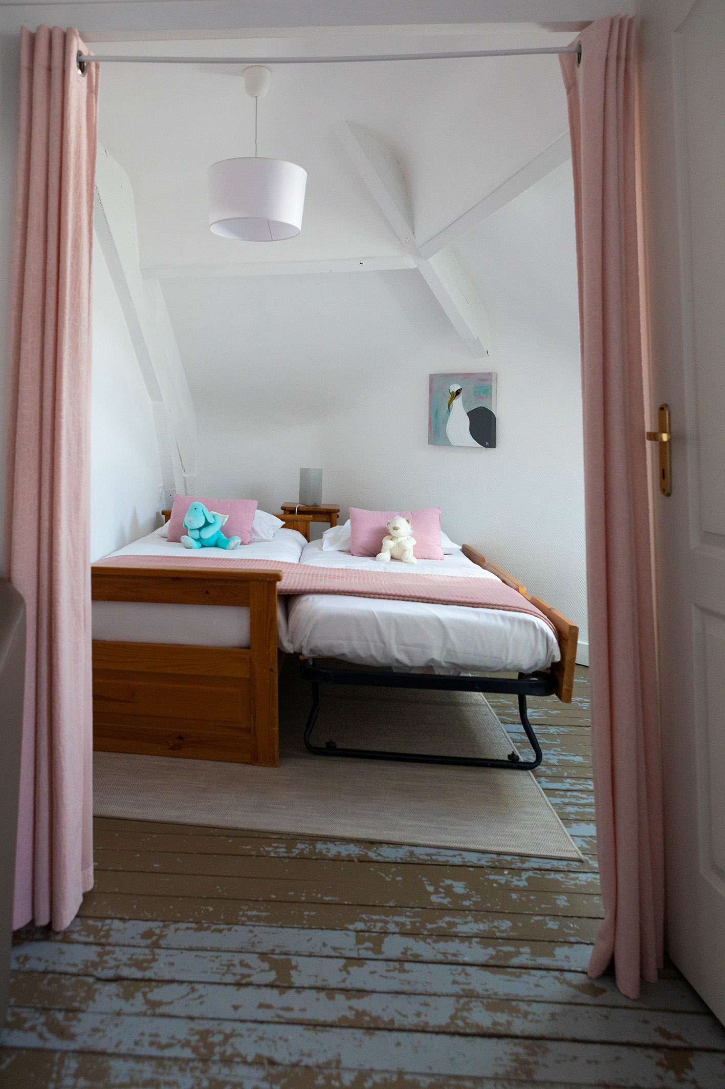 Our very spacious Family room has in a first room, a very comfortable large Double or Twin bed (2 beds of 90 cm); a separation with curtains opens onto a second room with two single beds (2 90 cm beds) reserved for children.